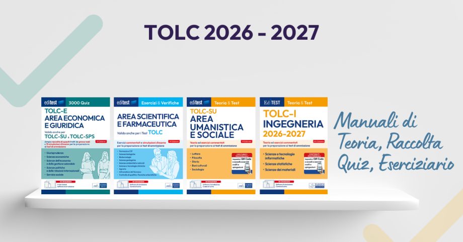 Per la preparazione ai TOLC 2026 – 2027, affidati ai volumi EdiTEST! Manuali di teoria, Raccolte di Quiz ed Eserciziari, per uno studio completo e mirato su tutte le materie che dovrai affrontare per entrare nel corso di laurea dei tuoi sogni!